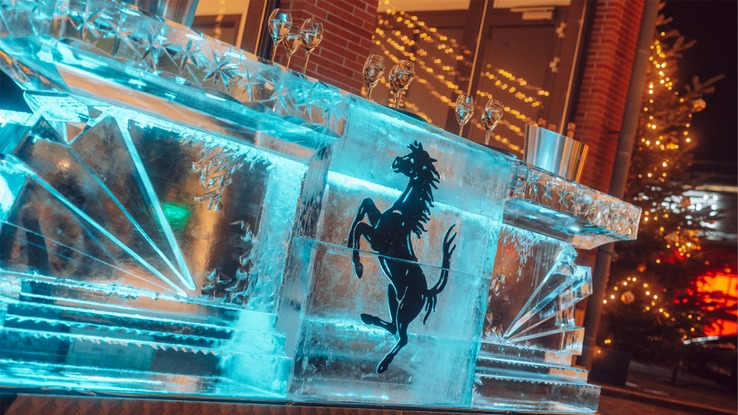 Nicht wiederzuerkennen war der Innenhof des Kölner Ferrari Händlers. Ein Sternenhimmel, Christbäume und Feuerschalen sorgten für unvergleichliche Weihnachtsstimmung. Mit Sicherheit eines der Highlights dieses außergewöhnlichen Set-ups: die eigens kreierte Eisbar, die trotz winterlicher Temperaturen zum Champagner einlud.